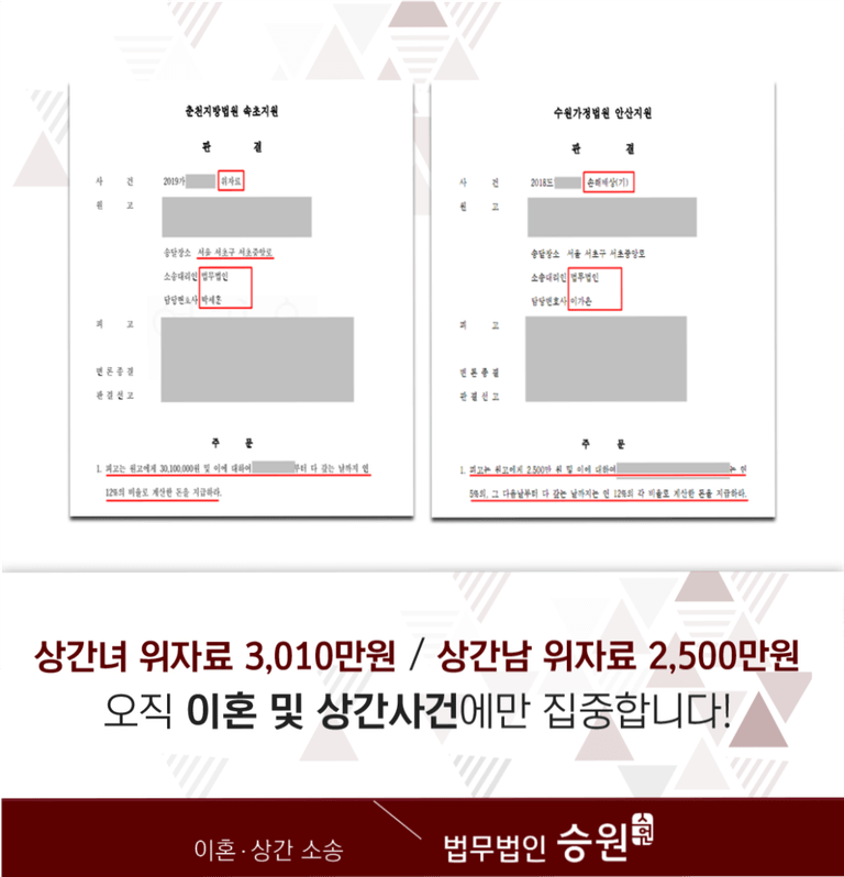 재판부가 승원의 주장을 거의 모두 인정해 주면서, 의뢰인(원고)께서는 위자료 2,000만 원을 인정받는 판결을 받아내실 수 있었습니다.