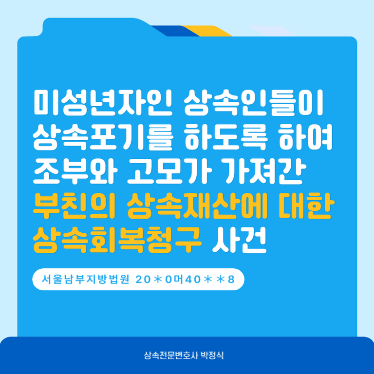 원고들은 부친인 피상속인의 미성년 자녀들이고, 피고들은 원고들의 조부와 고모, 피상속인의 소유의 부동산을 매수한 제3자입니다. 원고들의 부친은 원고들이 미성년자일 때 이혼을 하여, 원고들을 조부와 고모가 양육하고 있는 동안 갑자기 사망하였고, 원고들의 고모는 피상속인 사망 이후 원고들의 미성년후견인이 되어 원고들이 상속포기를 하도록 하였습니다. 이후 피상속인 소유의 부동산을 제3자에게 매각하여 고모가 가졌습니다.