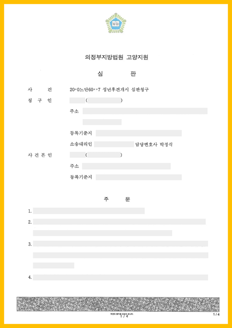 그러자 성년후견개시 결정이 난 후 차남은 이틀만에 성년후견개시심판청구를 취하하였고, 청구취하로 종국되었습니다.