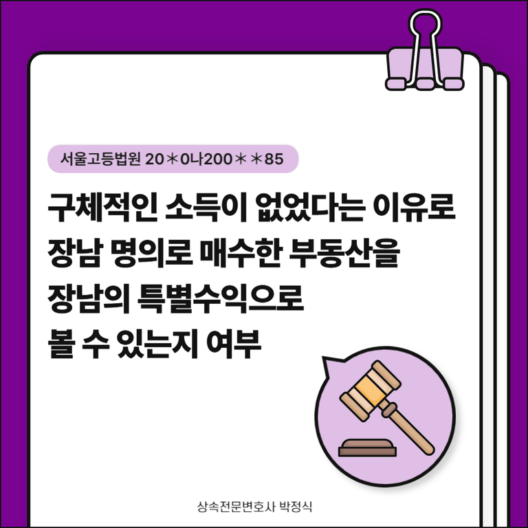 ② 장남의 명의로 아파트를 매수할 당시 장남은 별다른 소득이 없었다고 하더라도, 특별수익이란 주장하는 측에서 입증하여야 할 책임이 있으므로, 단지 장남이 소득이 없었다는 이유만으로 위 아파트를 피상속인이 매수하여 준 것으로 볼만한 근거가 없다고 보아 장남의 특별수익으로 인정하지 않았습니다.