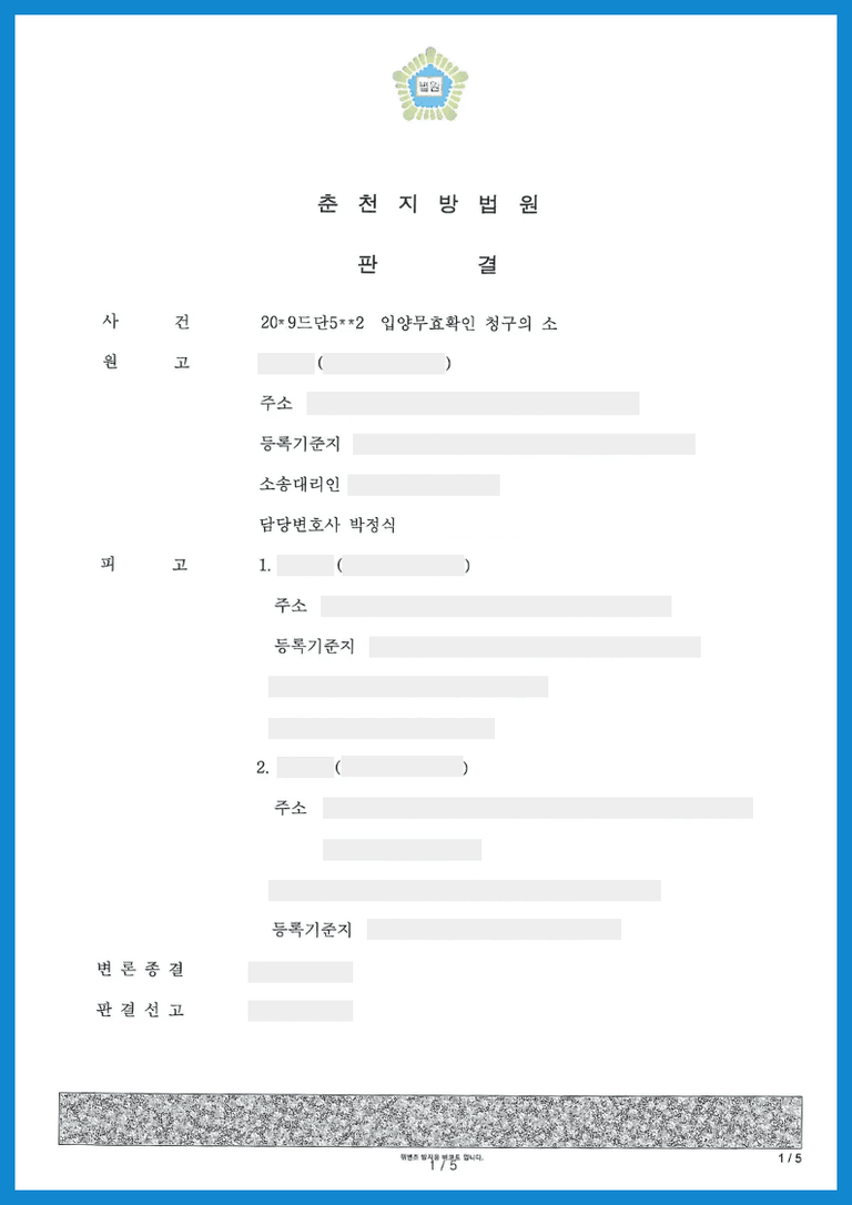 원고는 피고들을 상대로 피고1인 한 입양신고가 무효임을 확인하는 입양무효확인청구의 소를 제기한 사안입니다.