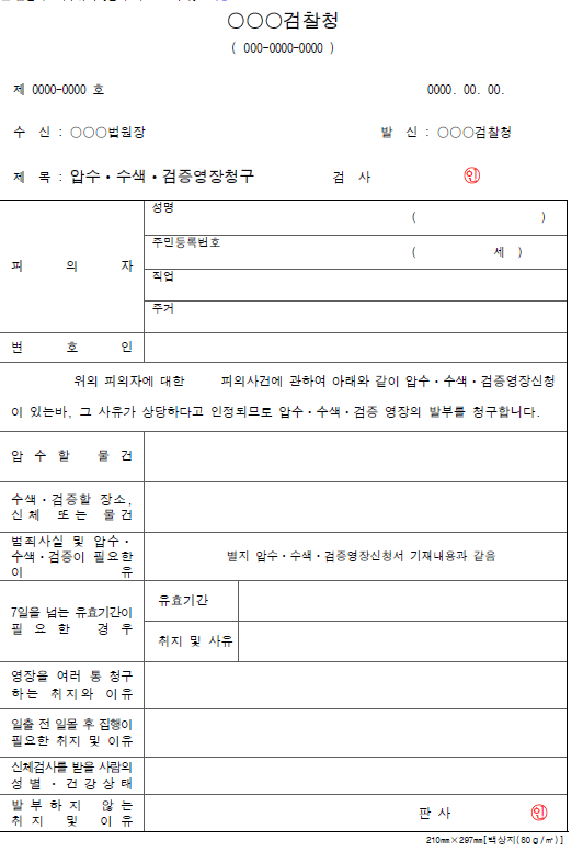그러면, 먼저 압수수색검증영장청구서의 서식은 아래와 같고, 위 청구서를 바탕으로 법원이 압수수색검증영장을 발부합니다.