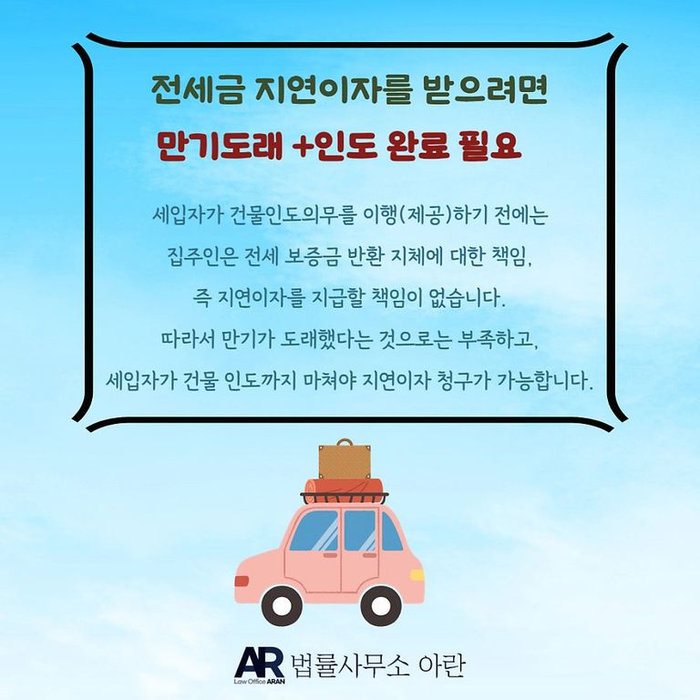 결국 세입자는 '나는 이사를 해서 건물 인도의무를 이행했는데, 집주인이 보증금을 안주고 있다. 그러니 지연이자까지 달라'라는 상태를 만들어야만 비로소 임대인에게 전세 보증금에 대한 지연이자를 부담시킬 수 있습니다.