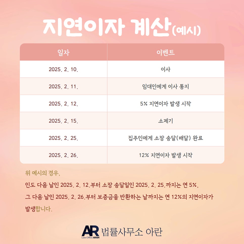 즉, 인도를 마친 다음 날부터 소장이 집주인에게 송달될 때까지는 연 5%, 소장이 집주인에게 송달된 다음 날부터 다 갚는 날까지는 연 12%의 지연이자가 발생한다.