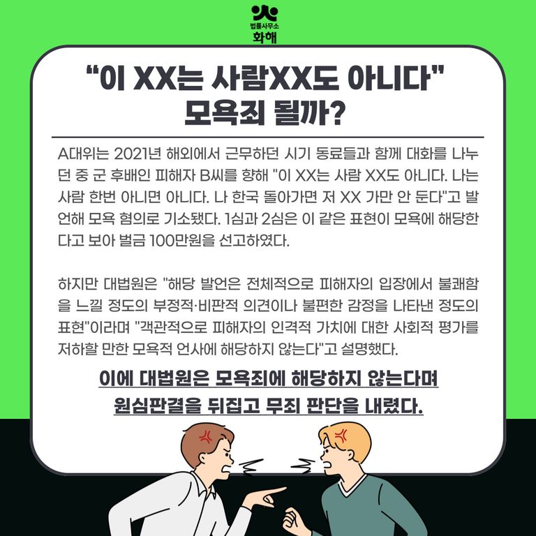 A대위는 2021년 해외에서 근무하던 시기 동료들과 함께 대화를 나누던 중 군 후배인 피해자 B씨를 향해 "이 XX는 사람 XX도 아니다. 나는 사람 한번 아니면 아니다. 나 한국 돌아가면 저 XX 가만 안 둔다"고 발언해 모욕 혐의로 기소됐다. 1심과 2심은 이 같은 표현이 모욕에 해당한다고 보아 벌금 100만원을 선고하였다.