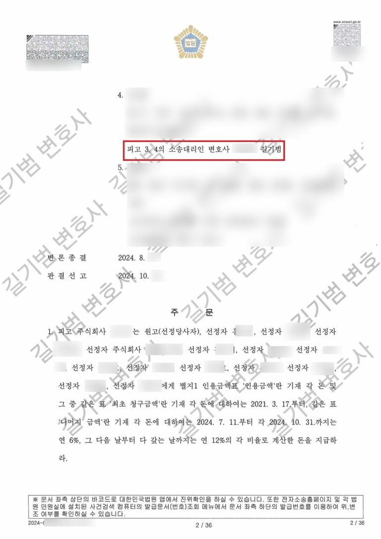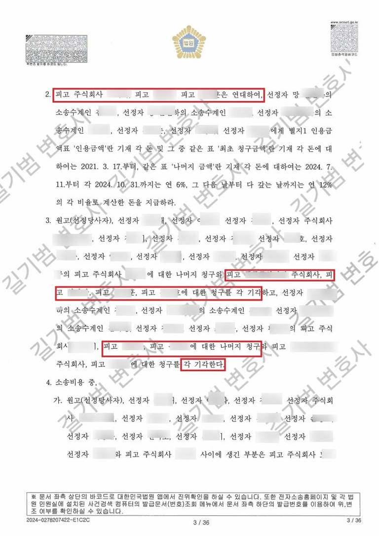 계약인수에 대해 수분양자들의 묵시적인 동의나 승낙이 있었다는 증거를 충실히 수집하여 제출하였고, 다행히 제가 대리한 피고 B, C의 경우 19명의 원고 및 선정자 중에서 4명에 대해서만 책임을 지라는 판결을 받을 수 있었습니다.