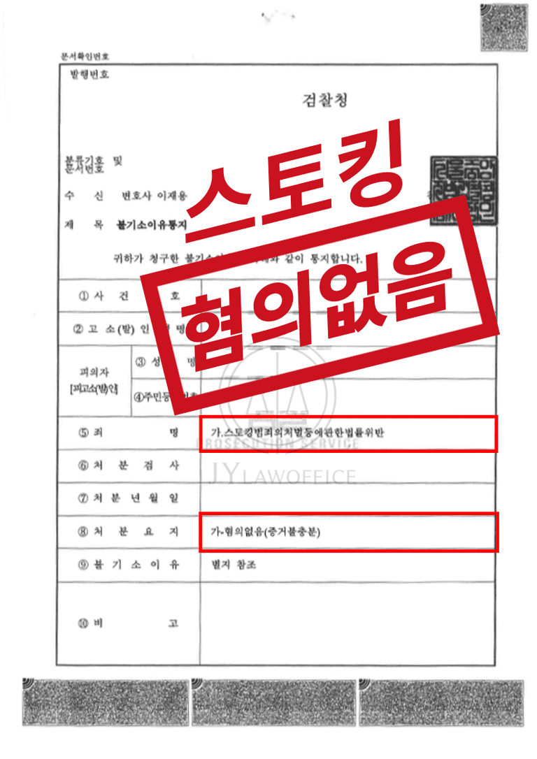 이와 같은 변호인의 조력을 통해, 의뢰인은 혐의없음 처분을 받고 스토킹 혐의를 벗을 수 있었습니다.