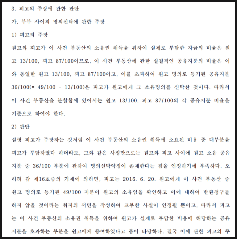 피고의 명의신탁 주장: 피고는 실제 자금 부담 비율에 따라 자신의 지분이 더 크다고 주장하며, 원고에게 명의신탁된 부분이 있다고 주장
