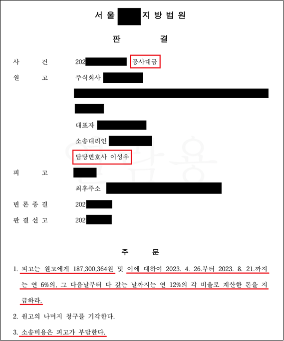 위와 같은 변호사의 적극적인 조력의 결과, 의뢰인은 청구금액 187,300,364원 중 187,300,364원을 그대로 인정받으며 억대가 넘는 금액의 승소 판결을 받아낼 수 있었습니다.