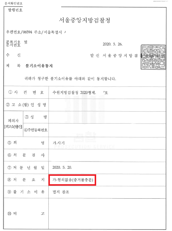 다행히도, 사건을 담당한 검찰은 변호인의 주장을 전부 받아들여 피의자(의뢰인)에 대한 '혐의없음(증거불충분)' 처분으로 사건을 종결하였습니다.