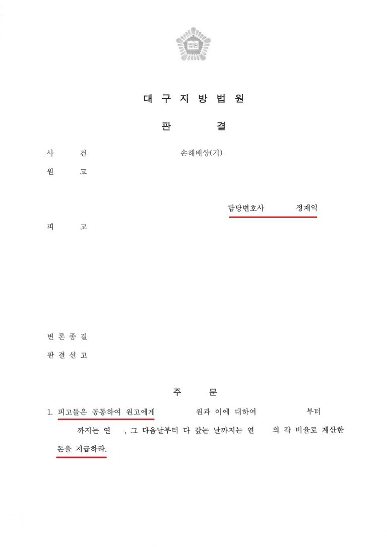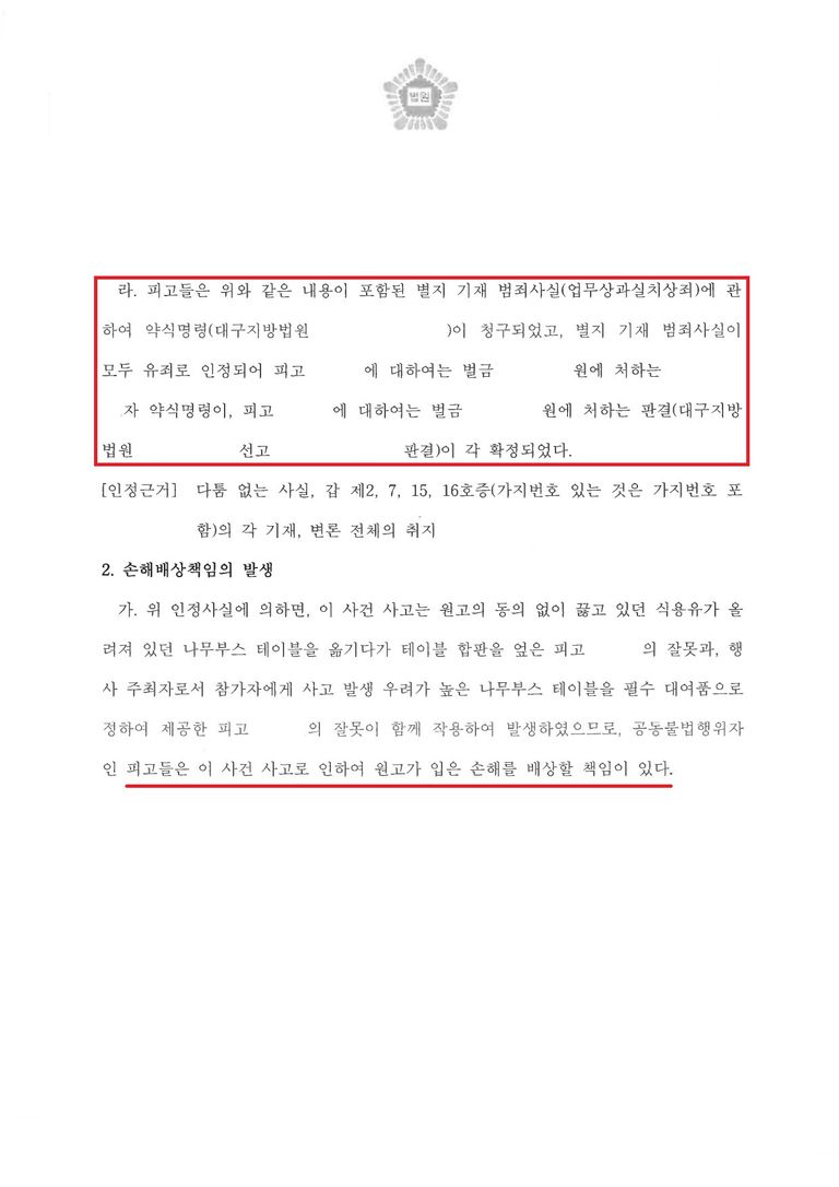 형사 소에서 확보한 확정 판결 내용을 민사 소송 증거로 제출하여, 피고측의 거짓 주장과 책임 전가 논리를 반박하였습니다.