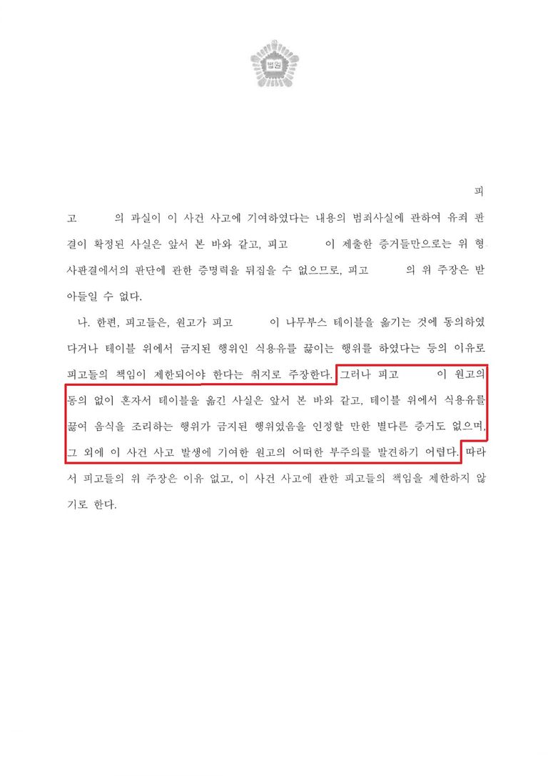 그러자 A는 갑자기 마음대로 의뢰인의 나무부스테이블을 옮기기 시작했고, 그 과정에서 테이블을 넘어뜨려 의뢰인에게 끓는 기름을 끼얹고 말았습니다. 의뢰인은 엉덩이부터 발목에까지 이르는 심각한 화상을 입었습니다.