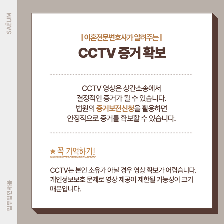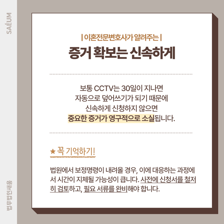 빠른 대응이 중요한 만큼, CCTV 증거가 필요한 경우 즉시 법적 조치를 취해야 하며, 이혼전문변호사의 도움을 받아 신속하고 정확한 신청이 이루어지도록 하는 것이 중요합니다.