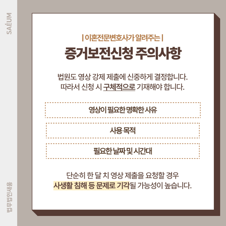 그러나 법원도 소유주의 동의 없이 강제로 영상을 제출하게 하는 조치를 신중하게 결정합니다. 따라서 신청 시 ① 영상이 필요한 명확한 사유, ② 사용 목적, ③ 필요한 날짜 및 시간대를 구체적으로 기재해야 합니다. 예를 들어, 단순히 ‘한 달 치 영상을 모두 제출해 달라’고 요청하면 사생활 침해 등의 문제로 인해 기각될 가능성이 높습니다. 반면 배우자와 상간자가 함께 출입한 날짜와 시간을 특정하여 신청하면 증거 확보 가능성이 훨씬 높아집니다.