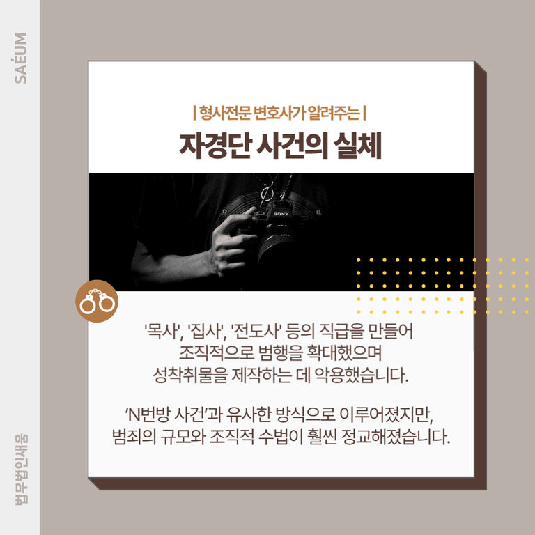 이 사건은 2020년 5월경부터 30대 남성이 '자경단'이라는 조직을 결성하면서 시작되었습니다. 피라미드식 계급 구조를 도입해 조직적으로 범행을 확대했으며, '목사', '집사', '전도사' 등의 직급을 만들어 성착취물을 제작하는 데 악용했습니다.