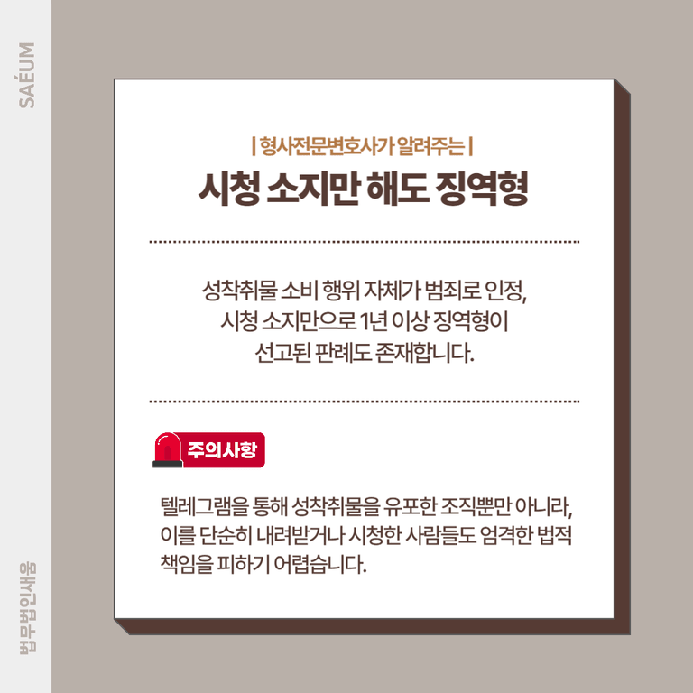 수사기관은 텔레그램으로부터 제공받은 각종 정보를 바탕으로 단기간에 대규모 검거를 진행했습니다. 이에 따라 많은 분들이 저희 사무실로 상담을 요청하고 계십니다. 특히, 텔레그램을 통해 성착취물을 시청하거나 소지한 사실이 드러날 경우 처벌을 받을 가능성이 있는지 우려하는 분들이 많습니다.