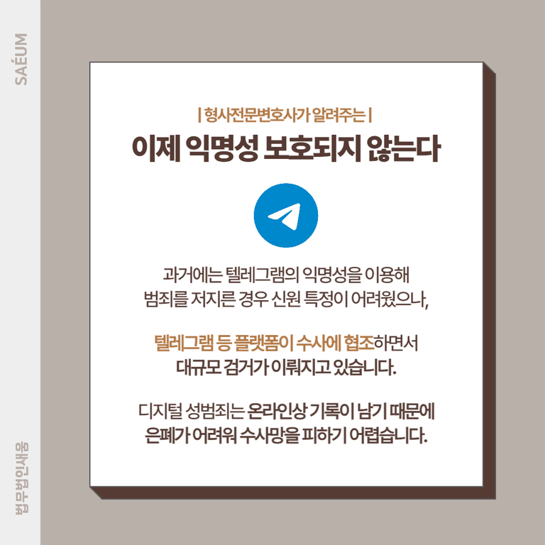 이미 수사기관이 텔레그램과의 협력을 강화하고 있는 만큼, 성착취물 제작·유포뿐만 아니라 시청·소지 행위도 적발될 가능성이 높아지고 있습니다.