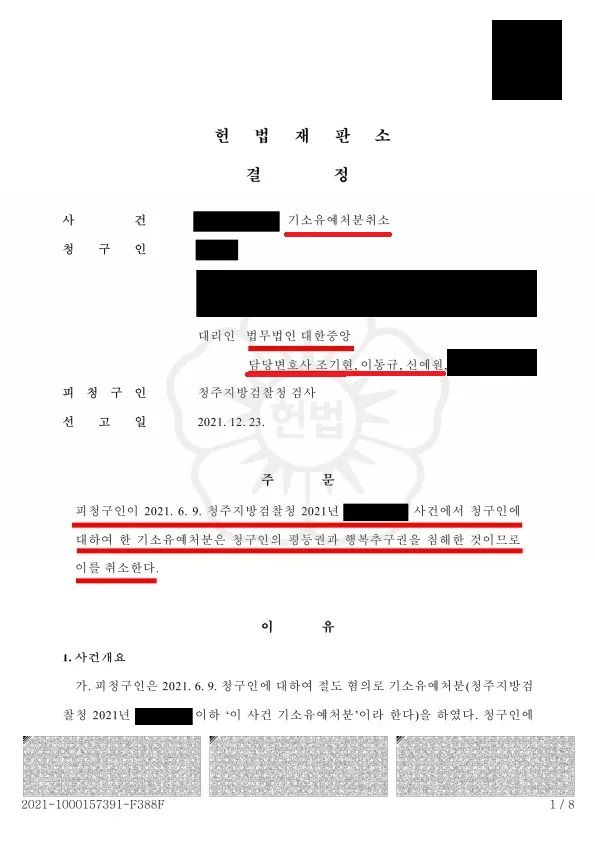 헌법재판소는 이동규 변호사의 주장을 받아들여 검사의 자의적인 기소유예 처분을 취소하는 결정을 하였습니다. 기소유예 처분이 취소되었기 때문에 징계처분의 근거가 없어졌으므로 추후 진행된 행정소송에서도 의뢰인은 이미 내려진 징계처분도 취소할 수 있었습니다.
