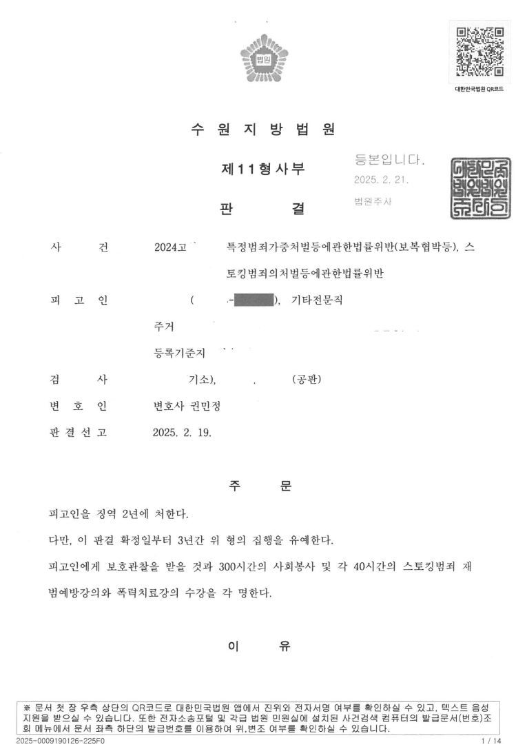 이 사건은 이미 동종 폭력전과가 있는 사람이 특가법 보복협박죄 등을 저질러 입건된 사안이었습니다. 기존 중대범죄로 실형 선고를 받은 전력이 있었고 나아가 특가법 보복협박죄는 벌금형이 없는 규정이었기 때문에 집행유예 선고를 받는 것이 최선이었습니다.