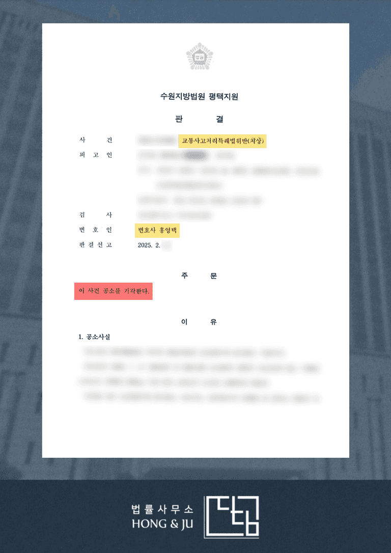 위와 같이 홍영택 안산교통사고변호사 조력한 결과, 법원은 검찰이 공소 제기 이후 의뢰인이 피해자와 합의에 이르렀고, 교통사고처리특례법에 따라 반의사불벌죄에 해당하므로 공소를 기각했습니다.
