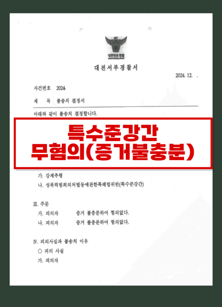 오늘 소개해드릴 사건은 특수준강간 혐의로 현행범 체포된 의뢰인의 사안을 신속하게 조력해 무혐의(증거불충분) 불송치를 받은 사건입니다.
