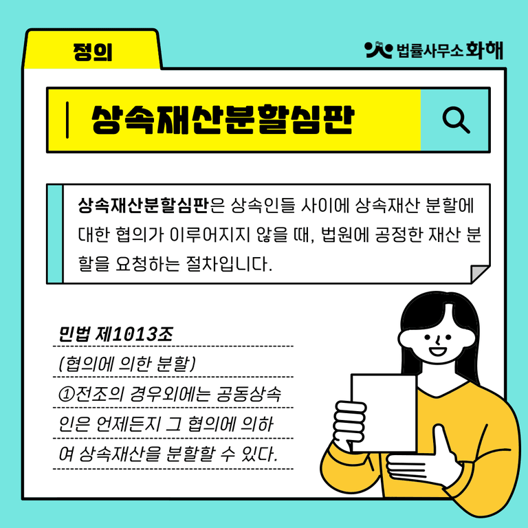 먼저 다소 생소할 수 있는 ‘상속재산분할심판’은 상속인들 사이에 상속재산 분할에 대한 협의가 이루어지지 않을 때, 법원에 공정한 재산 분할을 요청하는 절차입니다. 쉽게 말해서 가족들이 유산을 나누는 데 합의하지 못할 때, 법원에 도움을 요청하는 절차로 볼 수 있는데요. 이는 민법 제1013조에 근거하며, 상속인 중 한 명이 다른 모든 상속인을 상대로 청구할 수 있습니다.