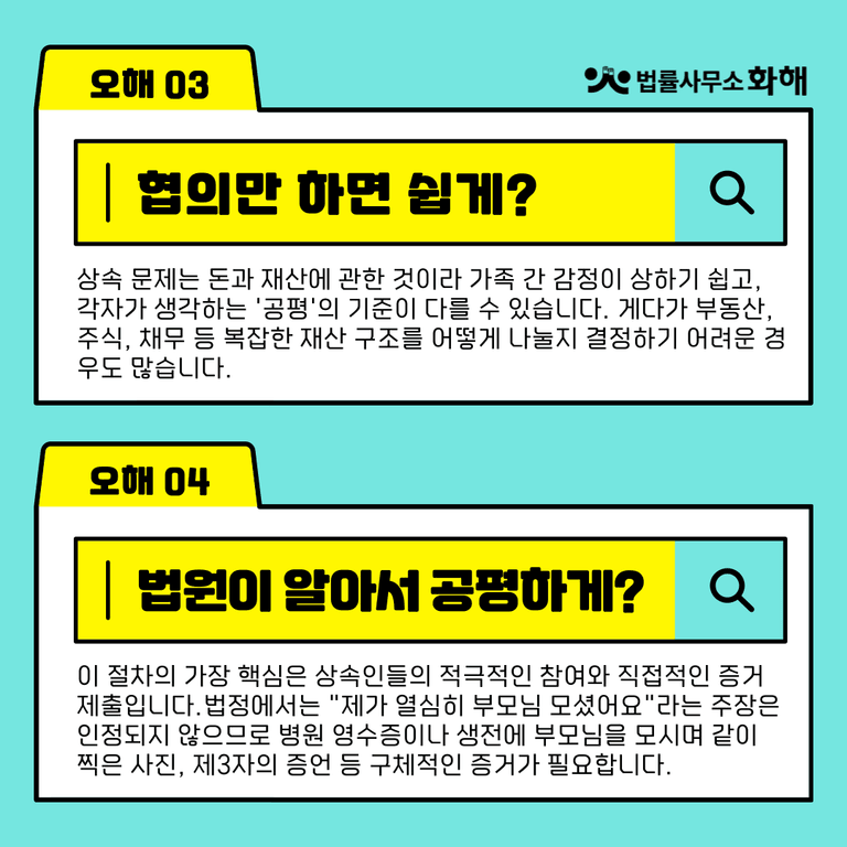 어려운 상속 문제, 혼자 고민하지 마시고 저희와 함께 해결해보는 건 어떠세요? 여러분의 평화로운 상속을 위해 법률사무소 화해가 항상 곁에 있겠습니다.