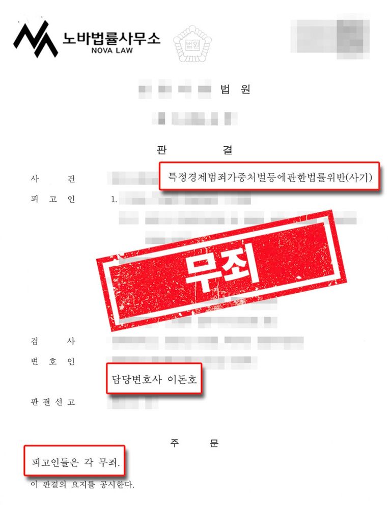 그렇게 노바법률사무소의 조력으로 의뢰인이 기계 납품 계약 및 생산 과정에서 사기행위를 할 의사가 없었음을 인정받아 1심에서 무죄판결을 받게 되었으며, 검사의 항소로 인해 치뤄진 항소심에서 역시 무죄판결을 받아 최종적으로 사기죄 혐의를 벗을 수 있었습니다.