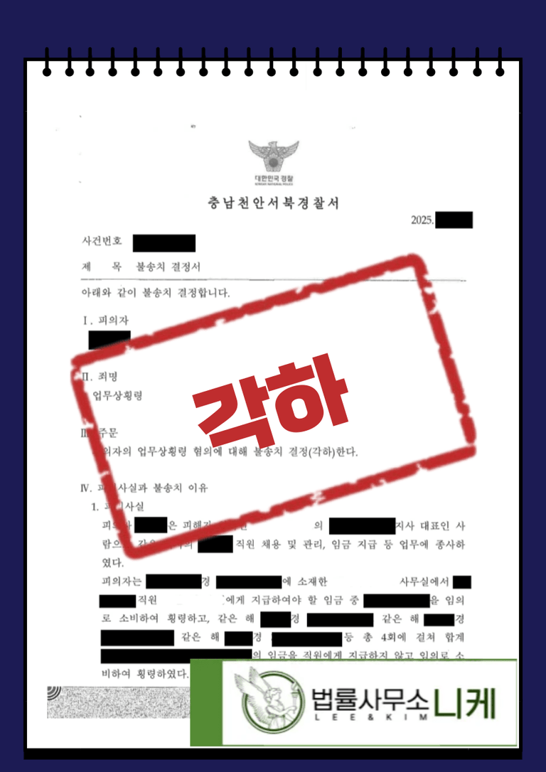 그 결과 의뢰인은 업무상횡령 혐의를 받고 법정형으로 최소 벌금형 최대 10년의 징역형을 선고받을 수 있었음에도 불구하고 불송치 처분을 받을 수 있었습니다.