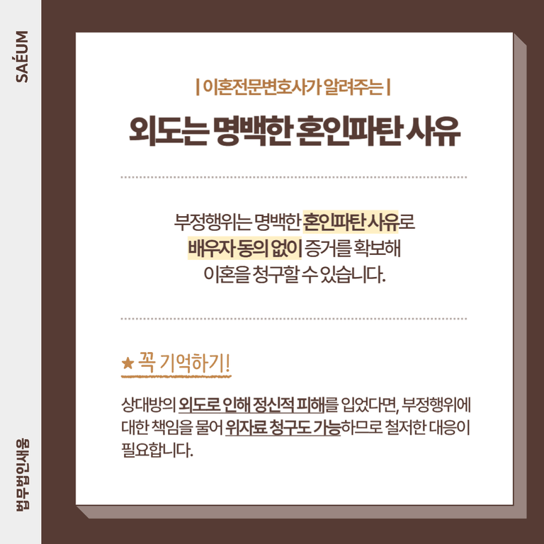 배우자의 외도나 불륜으로 인해 이혼을 결심하는 분들이 많습니다. 자녀가 있는 경우 그들을 위해 참고 넘어가려는 고민을 하기도 하지만, 한 번 깨진 신뢰를 회복하는 것은 쉽지 않기에 결국 이혼을 선택하게 되는 경우가 많습니다.