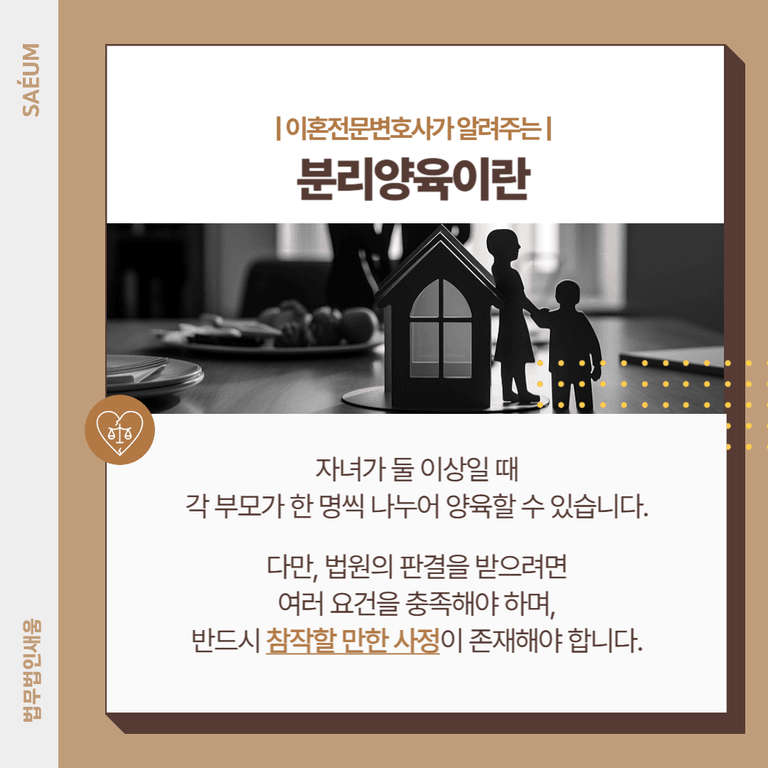 이 경우 분리 양육이 가능합니다. 즉, 자녀가 둘 이상일 때 각 부모가 한 명씩 나누어 양육할 수 있습니다. 다만, 법원의 판결을 받으려면 여러 요건을 충족해야 하며, 반드시 참작할 만한 사정이 존재해야 합니다.