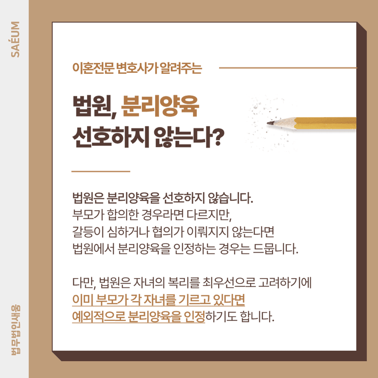 그러나 그렇다고 해서 분리 양육이 절대 불가능한 것은 아닙니다. 법원은 자녀의 복리를 최우선으로 고려하기 때문에, 이미 부모가 각자 자녀를 기르고 있고 이를 변경할 경우 자녀의 생활 환경이 크게 변하는 상황이라면 예외적으로 분리 양육을 인정하기도 합니다.
