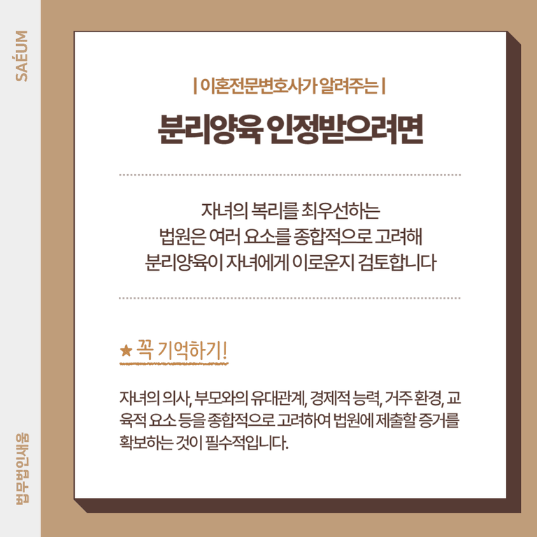 분리 양육을 주장하려면 법적 대응을 철저히 준비해야 합니다. 법원은 자녀가 부모 중 누구와 생활하는 것이 더 적절한지를 여러모로 검토하므로, 객관적인 증거를 통해 본인의 양육 능력을 입증하는 것이 중요합니다.