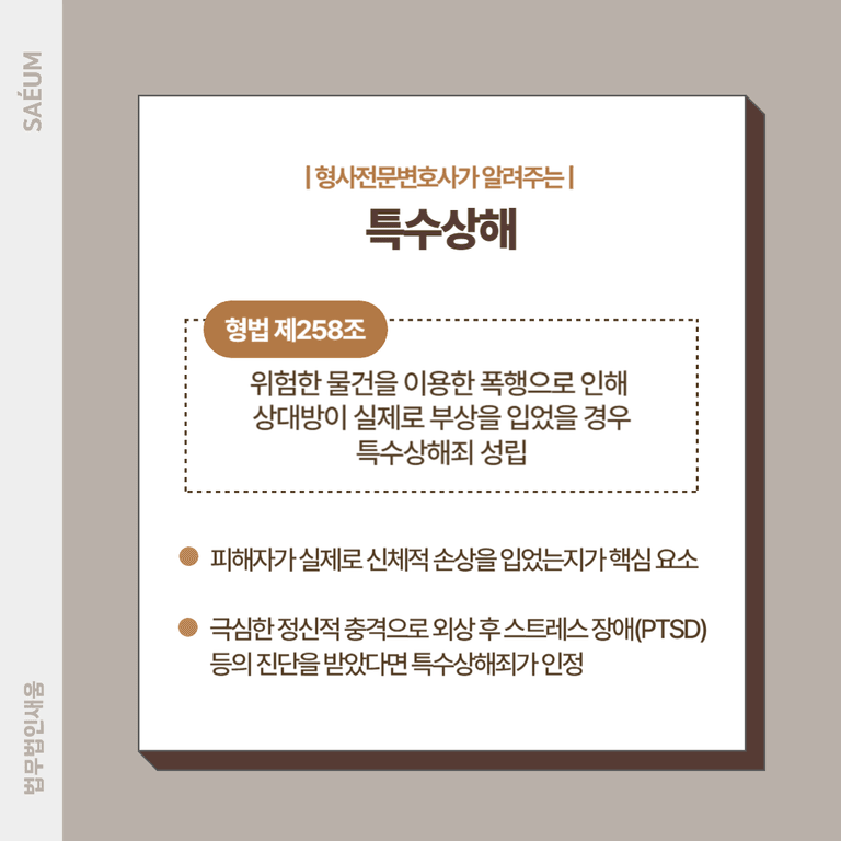 심지어 직접적인 신체 접촉이 없더라도, 극심한 정신적 충격으로 외상 후 스트레스 장애(PTSD) 등의 진단을 받았다면 특수상해죄가 인정될 수 있습니다.