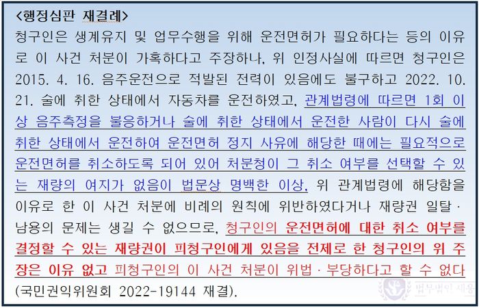 그런데 도로교통법은 2회 이상의 음주운전에 대한 면허 취소를 재량의 여지가 없는 기속행위로 규정하고 있습니다.