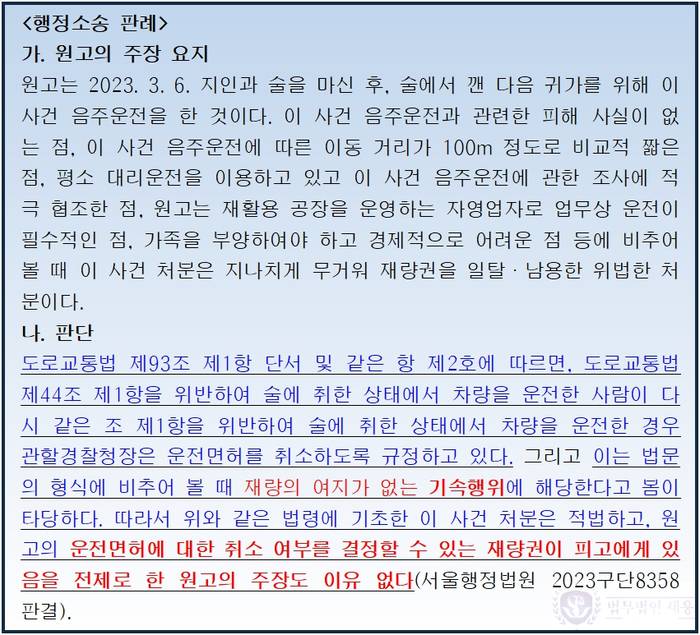 이러한 주장은 “취소를 안 해도 되는데 취소를 한 것은 나의 상황에 비추어 부당하다.”는 것이므로 당연히 행정청(경찰)에게 재량의 여지가 있음을 전제로 합니다. 따라서 행정청에게 재량권이 없는 기속행위에 대해서는 재량권의 일탈·남용 문제가 발생할 수가 없습니다.