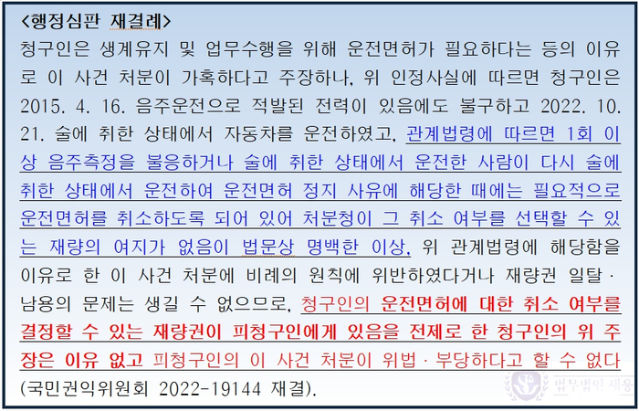 이 때문에 행정심판이나 행정소송에서는 “피고(피청구인)(=OOOO경찰청장)에게 재량권이 있음을 전제로 하는 원고(청구인)의 주장은 이유 없다.”고 결론이 날 수밖에 없습니다.