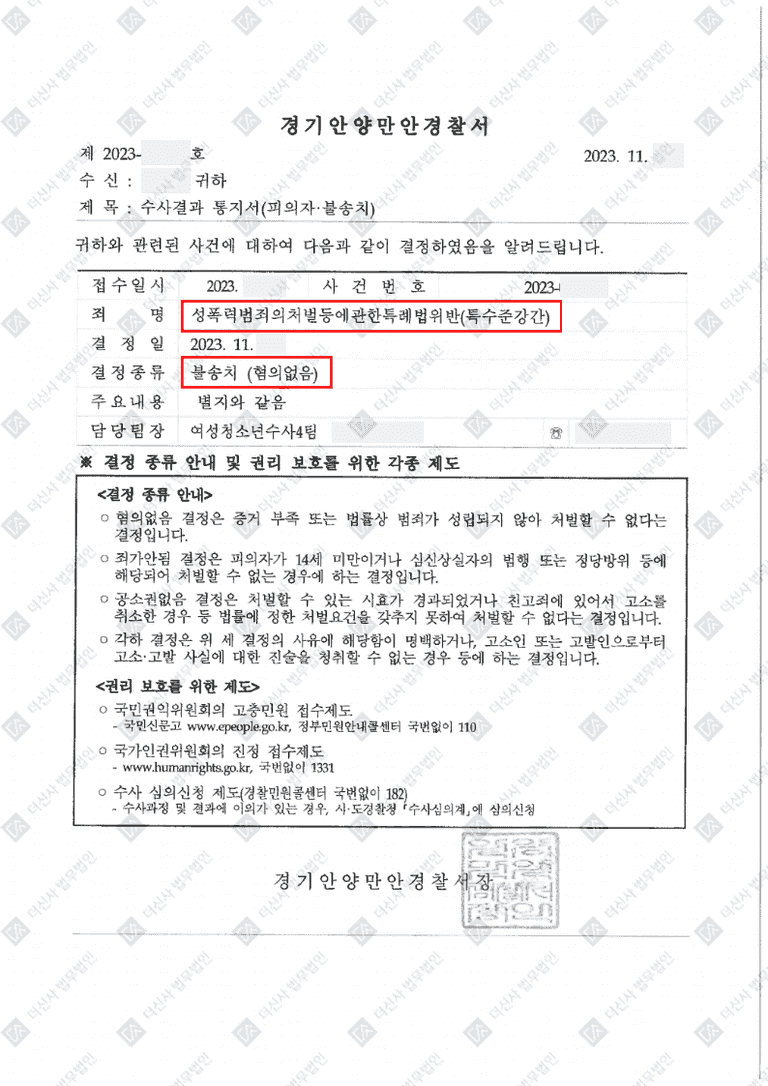 또한 의뢰인이 조사 과정에서 불리한 진술을 피할 수 있도록 사전 시뮬레이션을 실시하였습니다. 경찰 조사에는 변호사가 직접 동행하여 진술을 조율하며 의뢰인의 불안감을 최소화하는 데 집중하였고, 적극적인 변론과 함께 의견서를 제출하여 무혐의라는 성공적인 결과를 이끌어낼 수 있었습니다.