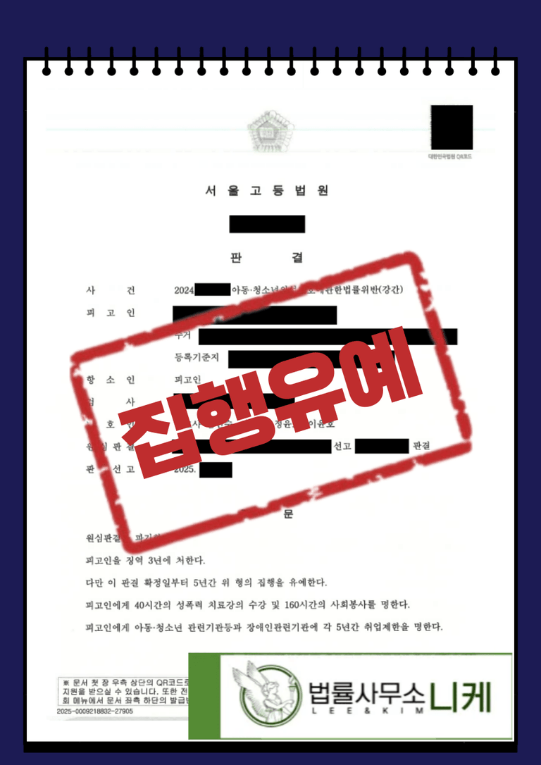 그 결과 의뢰인은 아동청소년의성보호에관한법률위반(강간) 혐의를 받고 법정형으로 최소 5년 이상의 징역형을 선고받을 수 있었음에도 불구하고 집행유예 처분으로 끝날 수 있었습니다.