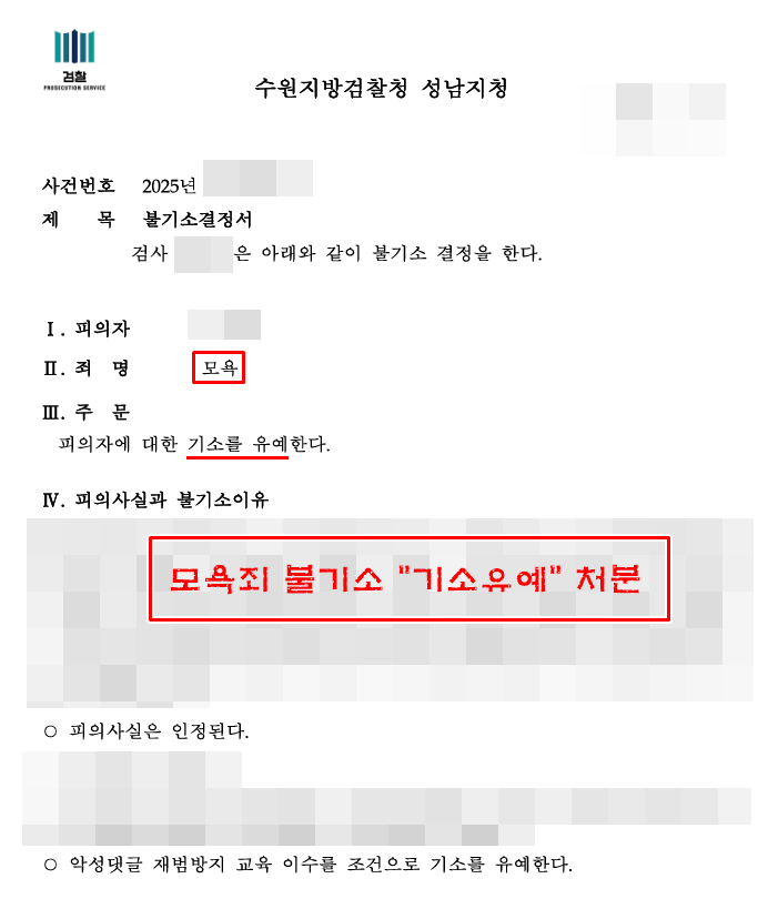 모욕죄 피고소 사건을 변호하여 "불기소(기소유예)" 처분을 이끌어낸 성공사례를 소개합니다.