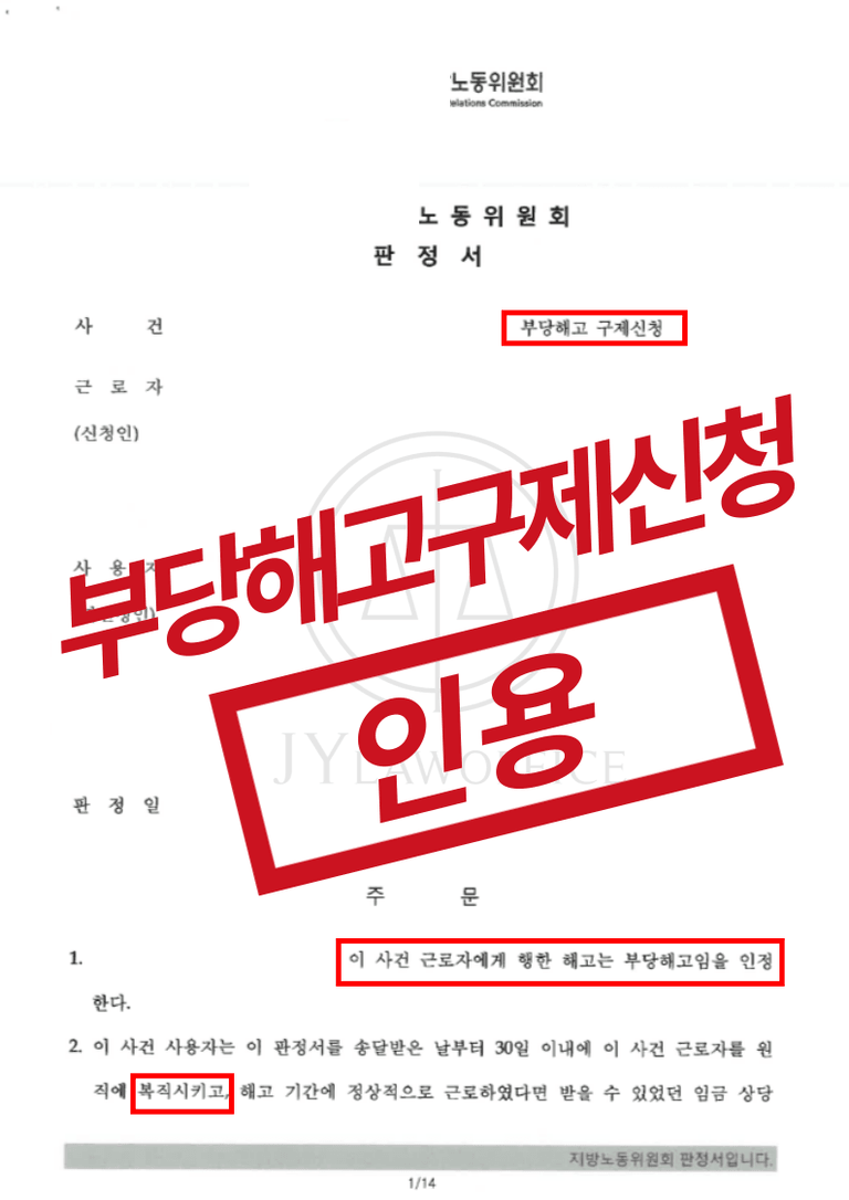 이와 같은 변호사의 조력을 통해, 의뢰인의 부당 해고 구제신청은 인용되었으며, 의뢰인은 사건을 무사히 종결하고 직장으로 돌아갈 수 있었습니다.