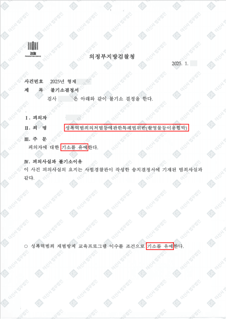 의뢰인이 경찰로부터 연락을 받은 직후 저희에게 도움을 요청했을 때, 사건의 심각성을 고려하여 신속한 대응이 필요했습니다. 메시지를 통해 성관계 영상을 통한 협박 행위가 인정되는 사안이었기에 최악의 경우, 실형의 가능성 조차 배제할 수 없는 심각한 상황으로 인해 의뢰인은 극도의 불안감을 느끼고 있었으나, 저희는 유사한 사건에서 기소유예를 이끌어낸 사례를 바탕으로 철저한 법적 대응이 가능하다는 점을 설명드렸습니다.