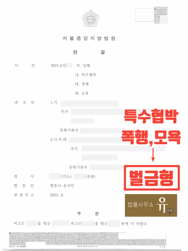 특수협박, 폭행, 모욕 등 사건을 조력한 결과, 재판부는 담당 변호인의 변론과 서면 그리고 탄원서 자료들을 검토하고 이를 참작하여 징역형이 아닌 벌금 선고로 선처하였습니다.