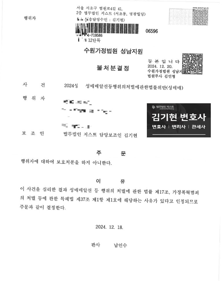 가정법원의 결정은 형사재판이라 보기 어렵고, 주문 역시 형벌을 내리지 않고 보호처분을 내리게 되는데, 적절한 변호를 통해 의뢰인은 보호처분조차 받지 않고 불처분 결정을 받게 되었습니다.