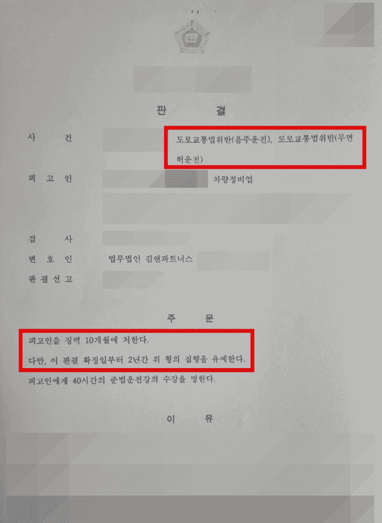 👇이 글에서는 과거 음주운전 전력으로 이미 면허가 취소된 상태에서 또다시 음주운전을 하여 법정구속 위기에 처한 상황이었으나 저희 법무법인의 조력으로 집행유예 판결을 받아 실형을 면할 수 있었던 사례를 소개하려 합니다.