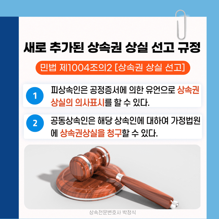 위 민법 개정안에 추가되는 민법 규정이 바로 현행 민법 제1004조[상속인의 결격사유] 다음에 규정된 민법 제1004조의2[상속권 상실 선고] 규정으로 지금까지는 없었던 상속인의 상속권을 상실시킬 수 있는 규정입니다.