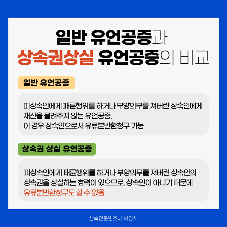 위와 같이 민법 개정안에 새롭게 추가되는 민법 제1004조의2[상속권 상실 선고] 규정에 따르면 피상속인이 유언공증을 통하여 부모인 상속인의 상속권을 상실시킬 수 있도록 규정하고 있는바, 이러한 "상속권 상실 선고 유언공증"과 "일반 유언공증"에는 어떠한 차이가 있을까요?