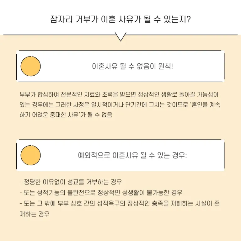 더 심각한 경우는 반려동물이 잠자리까지 같이 하여 부부간의 친밀한 관계에 방해가 되는 경우입니다. 만약 한쪽 배우자가 반려동물 때문에 잠자리를 거부하거나 성적 욕구 충족이 어렵게 된다면, 이는 ‘혼인을 계속하기 어려운 중대한 사유’에 해당할 수 있습니다. 다만, 부부가 함께 치료나 상담을 통해 문제를 해결할 수 있는 가능성이 있다면 일시적 문제로 보아 이혼 사유로 인정되기 어렵습니다.