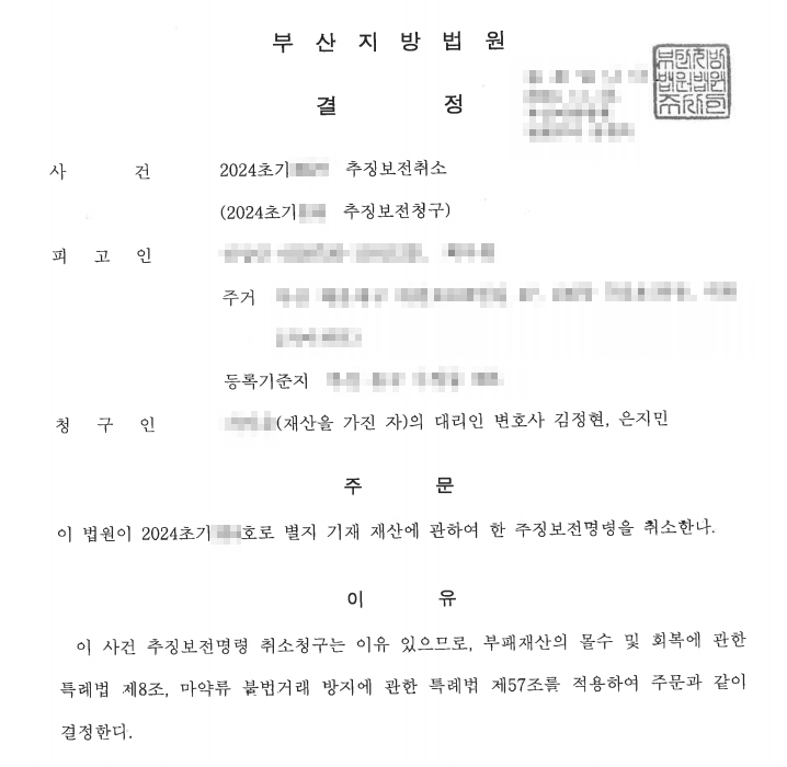 재판부에서는 위와 같은 변호인의 주장을 받아들여, 의뢰인 재산에 대한 추징보전명령은 부당하다고 판단하고 추징보전취소 청구를 인용하여 주었습니다.