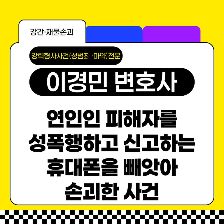 의뢰인은 연인관계였던 피해자를 강제로 성폭행하였다는 사실로 경찰신고를 하는 도중 피해자의 휴대전화를 강제로 뺏어 손괴하였다는 혐의로 경찰조사를 받게 되었습니다.